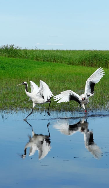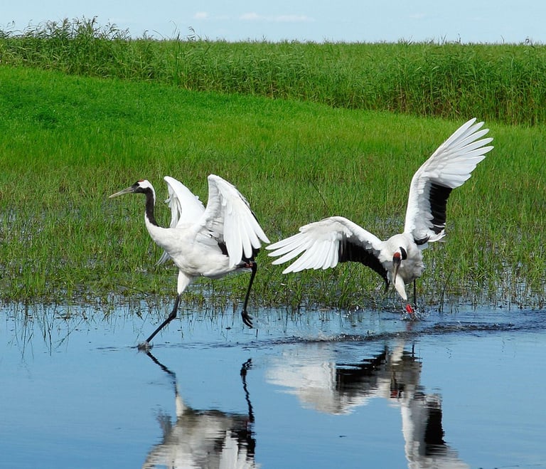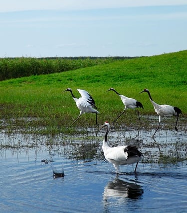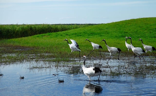 The Greater and Lesser Khingan ranges are covered with larch, pine, and birch forests, home to sables, foxes, and Asiatic black bears. Wetlands such as the Zhalong Nature Reserve shelter migratory birds, especially the endangered red-crowned crane. Lakes like Jingpo host diverse fish species, while river valleys along the Amur nurture unique ecosystems shared with Russia.