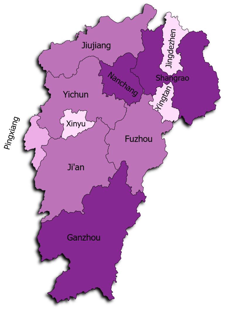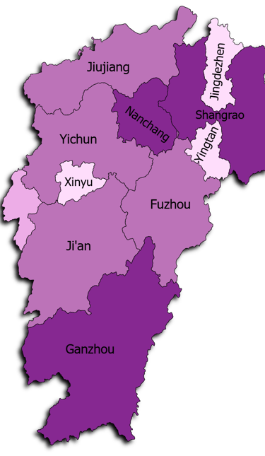 Jiangxi is an important economic center in southeastern China. Cities along the Gan River, including Nanchang, Jingdezhen, and Ganzhou, form hubs for industry, ceramics, agriculture, and mining.